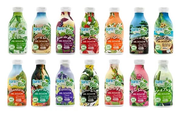 Born to Bio Douchegels zijn beschikbaar in 14 geuren: tropical mango, karitéboter, kokos, aloë & bamboe, mandarijn, bosbessen, perzik, rozen, sinaasappelbloesem, zen & groene thee, viooltjes, aarbei, vanille & kokos.